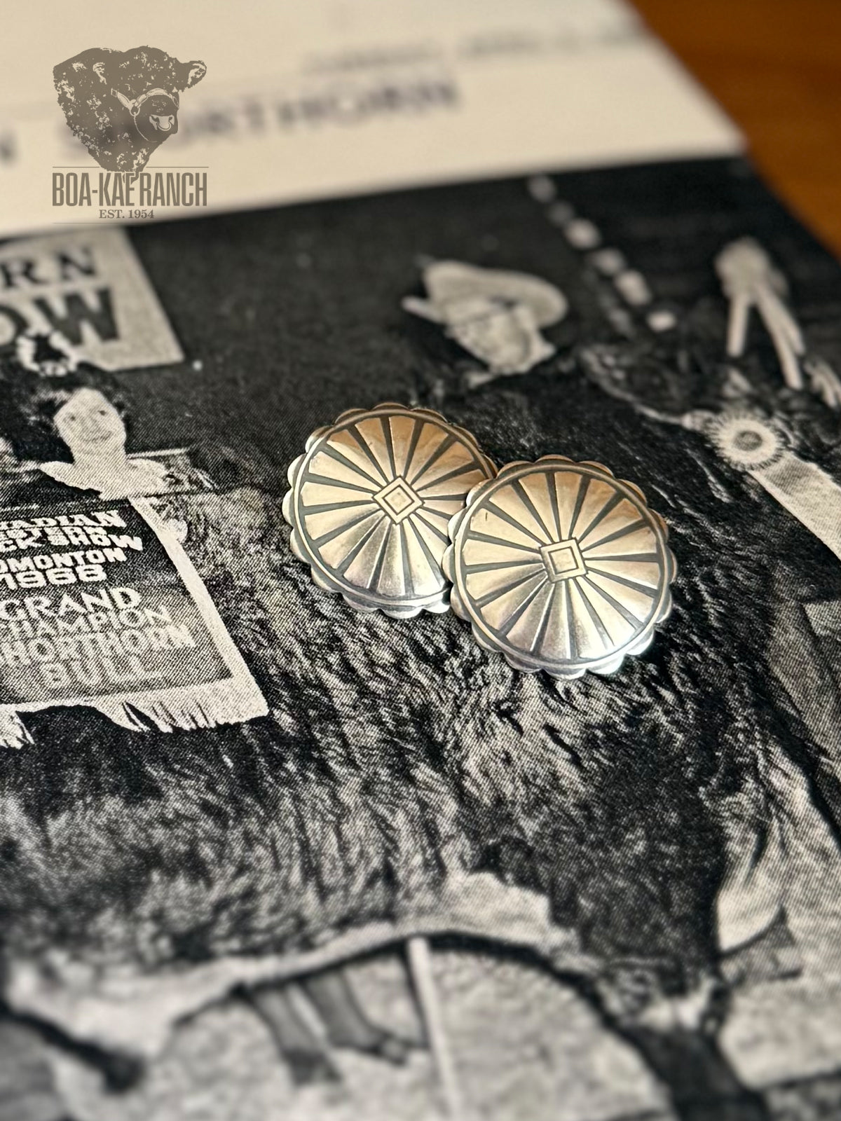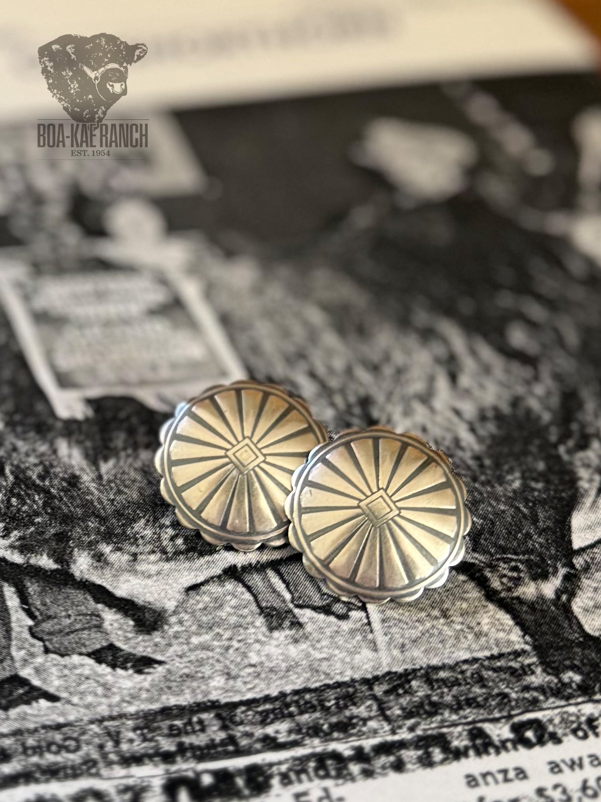 • Brushed sterling silver with stamped sun ray design and scalloped border• Domed in shape• 0.75 x 0.75• Lightweight• Handmade